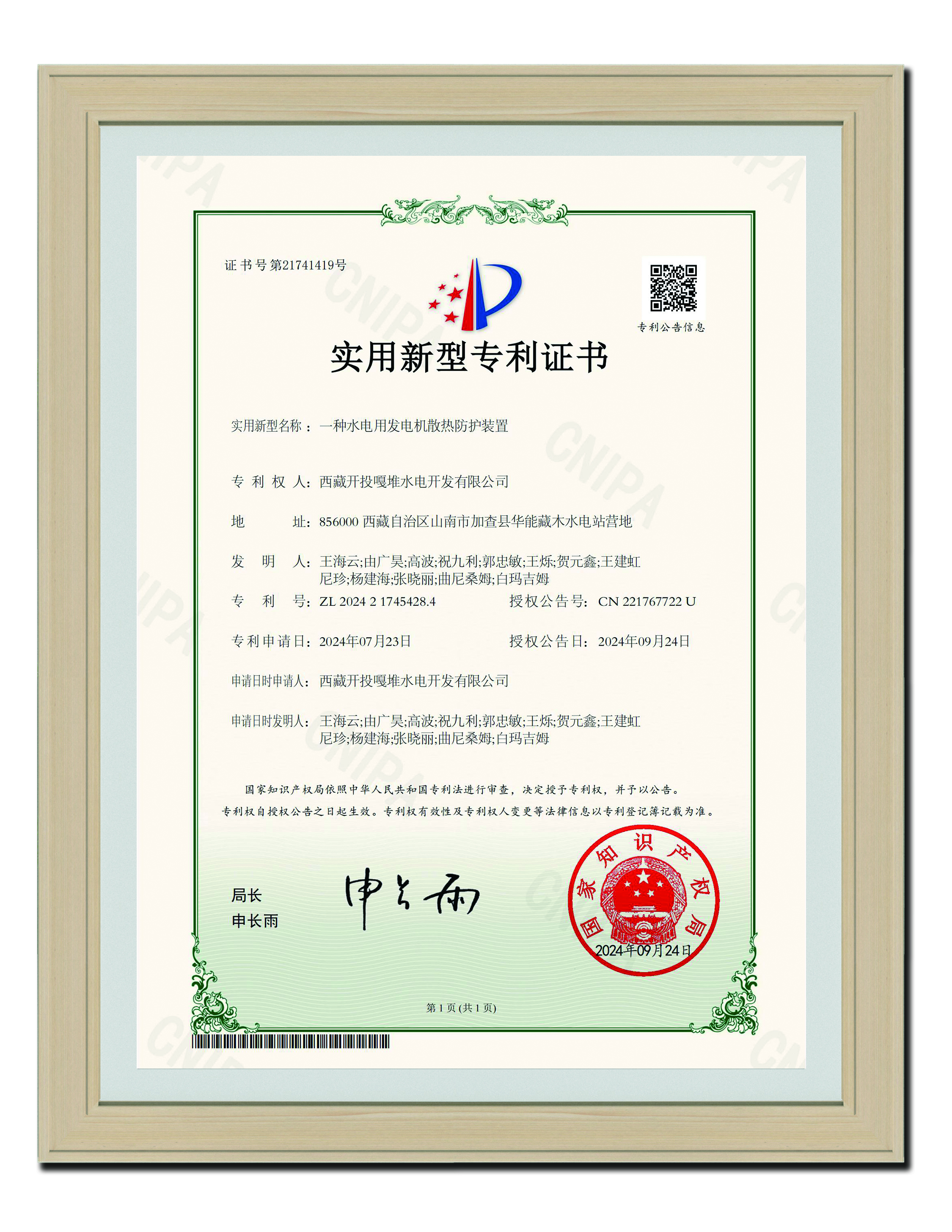 2024-09-24 實用新型專利證書_一種水電用發(fā)電機散熱防護裝置