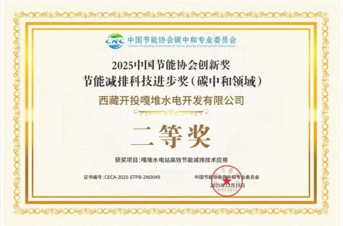 近日,中國節(jié)能協(xié)會2025年度創(chuàng)新獎獲獎名單正式公布,西藏開投嘎堆水電公司申報的“嘎堆水電站高效節(jié)能減排技術(shù)應(yīng)用”項目榮獲“節(jié)能減排科技進步獎(碳中和領(lǐng)域) 二等獎”。