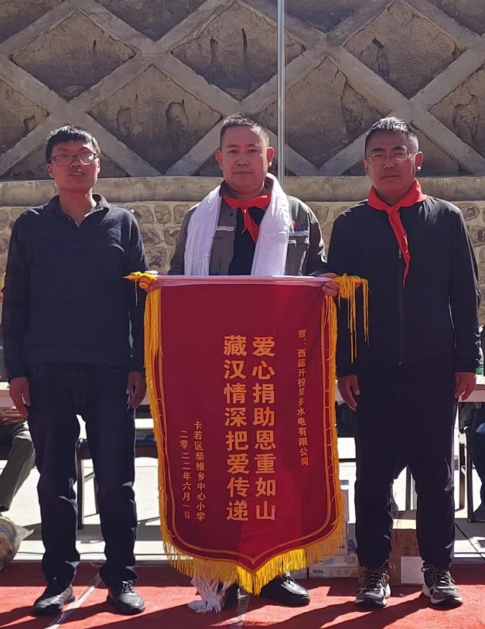 果多水電公司代表張二林同志作了題為“祖國(guó)的未來,民族的希望”的講話,并代表果多水電公司給學(xué)校捐贈(zèng)了學(xué)習(xí)用品,足球、排球、羽毛球等,勉勵(lì)孩子們要樹立遠(yuǎn)大理想,努力學(xué)習(xí),健康成長(zhǎng),以優(yōu)異的成績(jī)回報(bào)社會(huì)、回報(bào)祖國(guó)。柴維鄉(xiāng)小學(xué)贈(zèng)送了“愛心捐助恩重如山,藏漢情深把愛傳遞”的錦旗,感謝果多水電公司對(duì)學(xué)校的關(guān)心支持幫助。