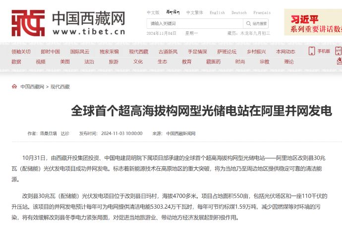 媒體報道丨全球首個超高海拔構(gòu)網(wǎng)型光儲電站在西藏阿里并網(wǎng)發(fā)電