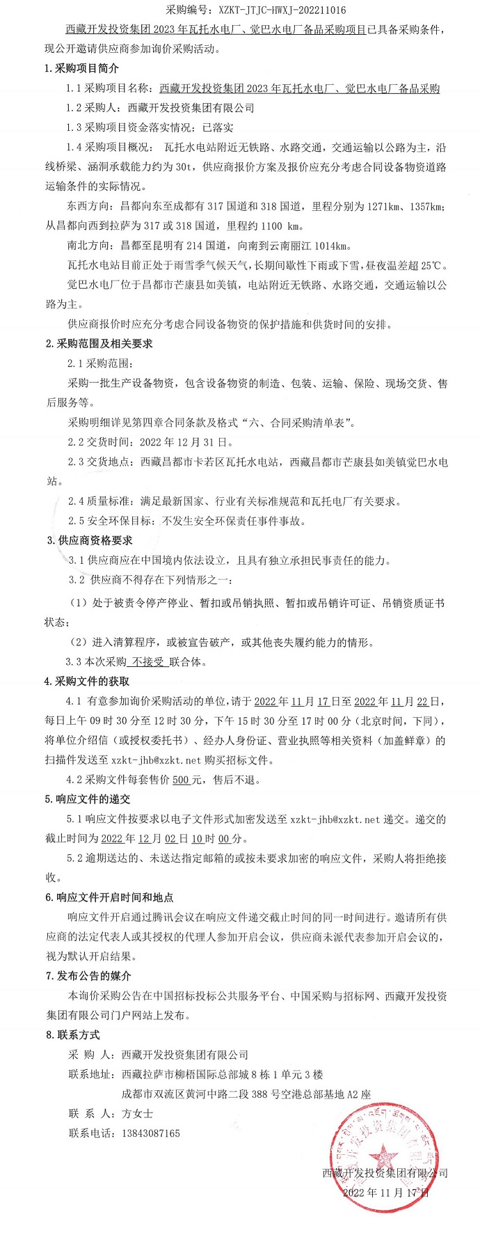 西藏開發(fā)投資集團(tuán)2023年瓦托水電廠、覺巴電廠備品采購公告