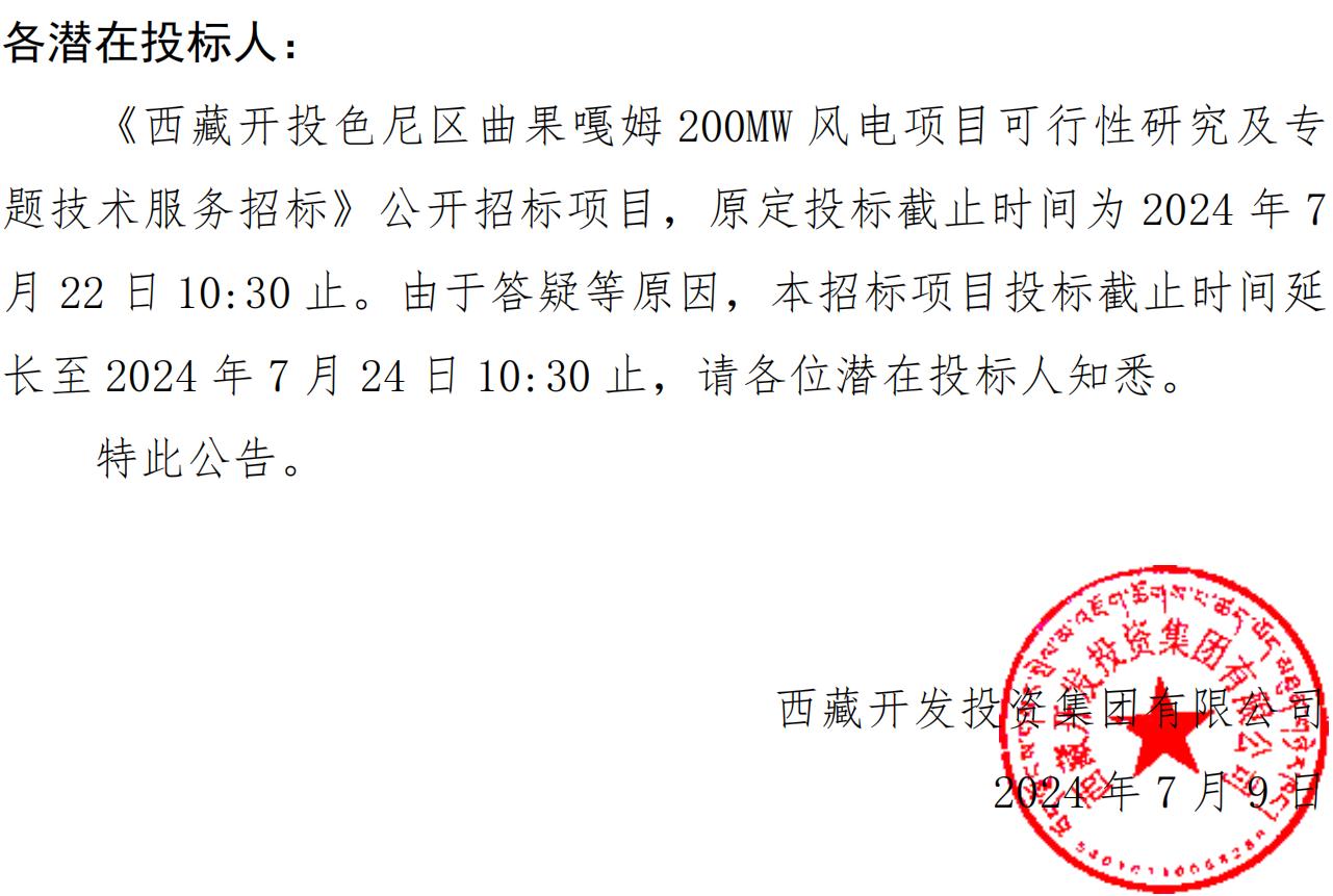 關(guān)于延長《西藏開投色尼區(qū)曲果嘎姆200MW風電項目可行性研究及專題技術(shù)服務招標》投標截止時間的公告