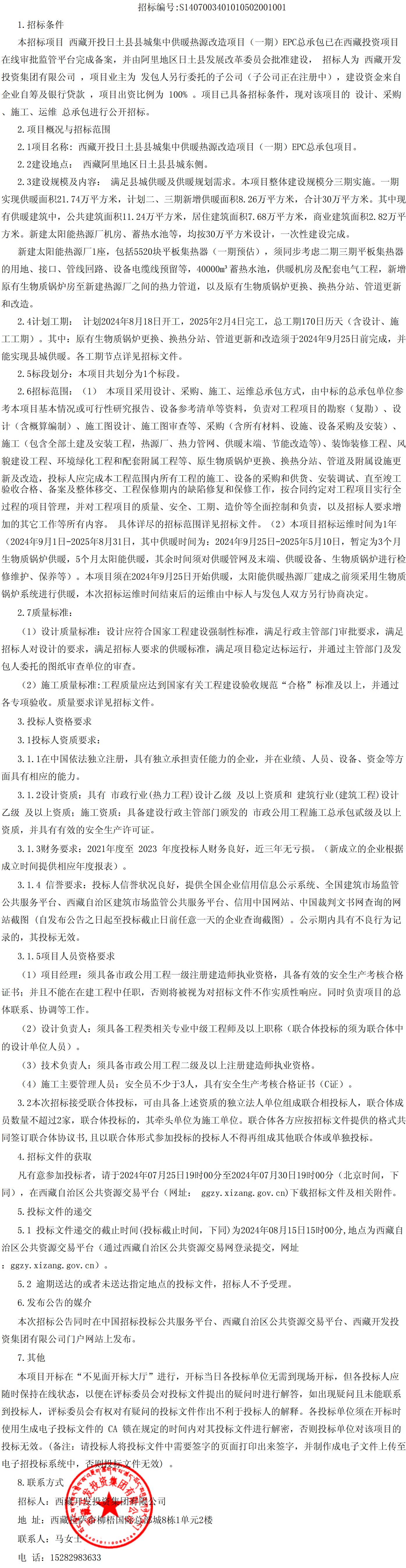 西藏開(kāi)投日土縣縣城集中供暖熱源改造項(xiàng)目(一期)EPC總承包招標(biāo)項(xiàng)目招標(biāo)公告