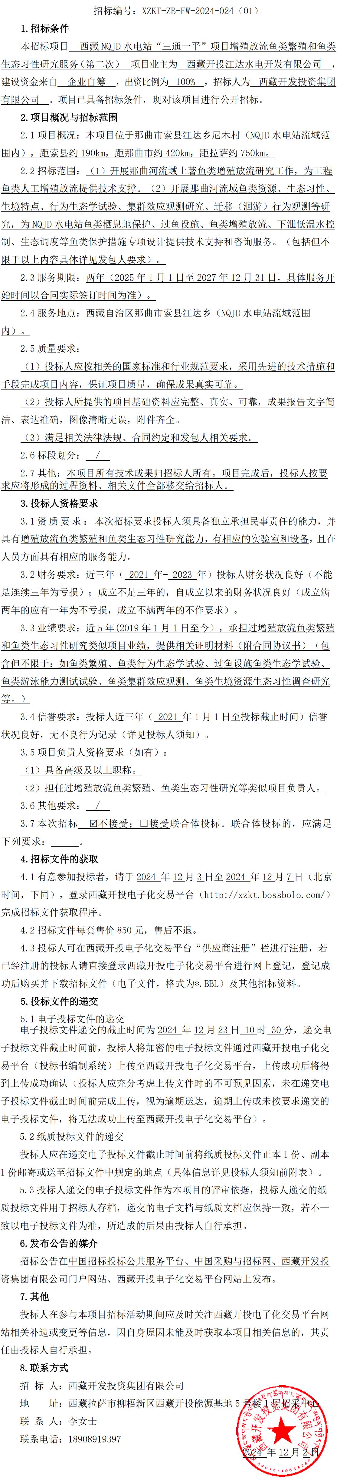 西藏 NQJD 水電站“三通一平”項目增殖放流魚類繁殖和魚類生態(tài)習(xí)性研究服務(wù)(第二次)招標(biāo)公告