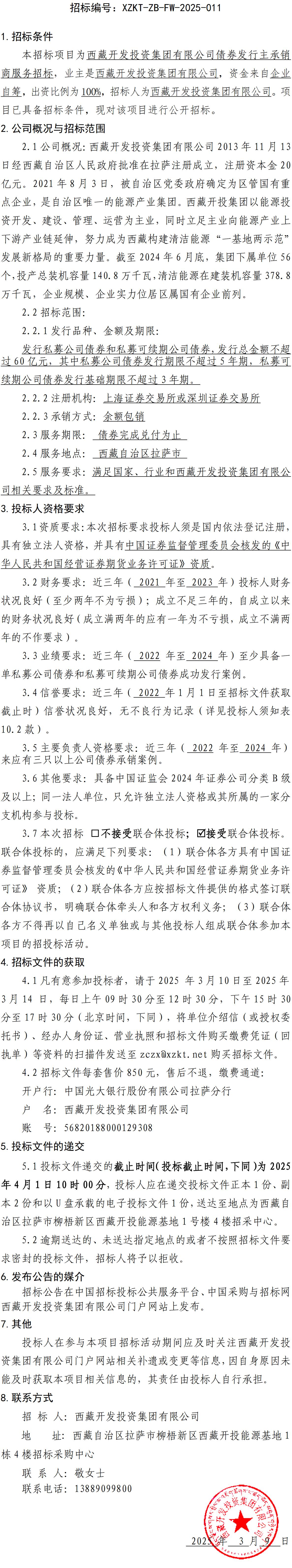西藏開發(fā)投資集團有限公司債券發(fā)行主承銷商服務(wù)招標(biāo)公告